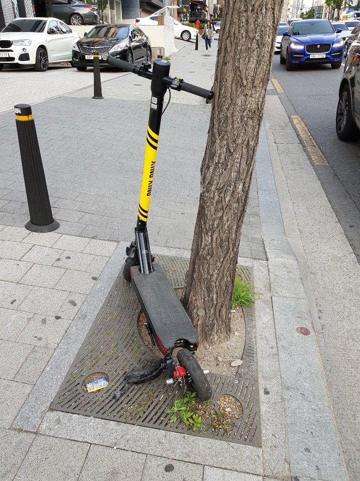 (아래 사진 참고, 그리고 역삼에서 학동을 지나가면서 씽씽 뿐만아니라 킥고잉 전동킥보드도 부숴진 전동킥보드를 3~4대 보았다...)