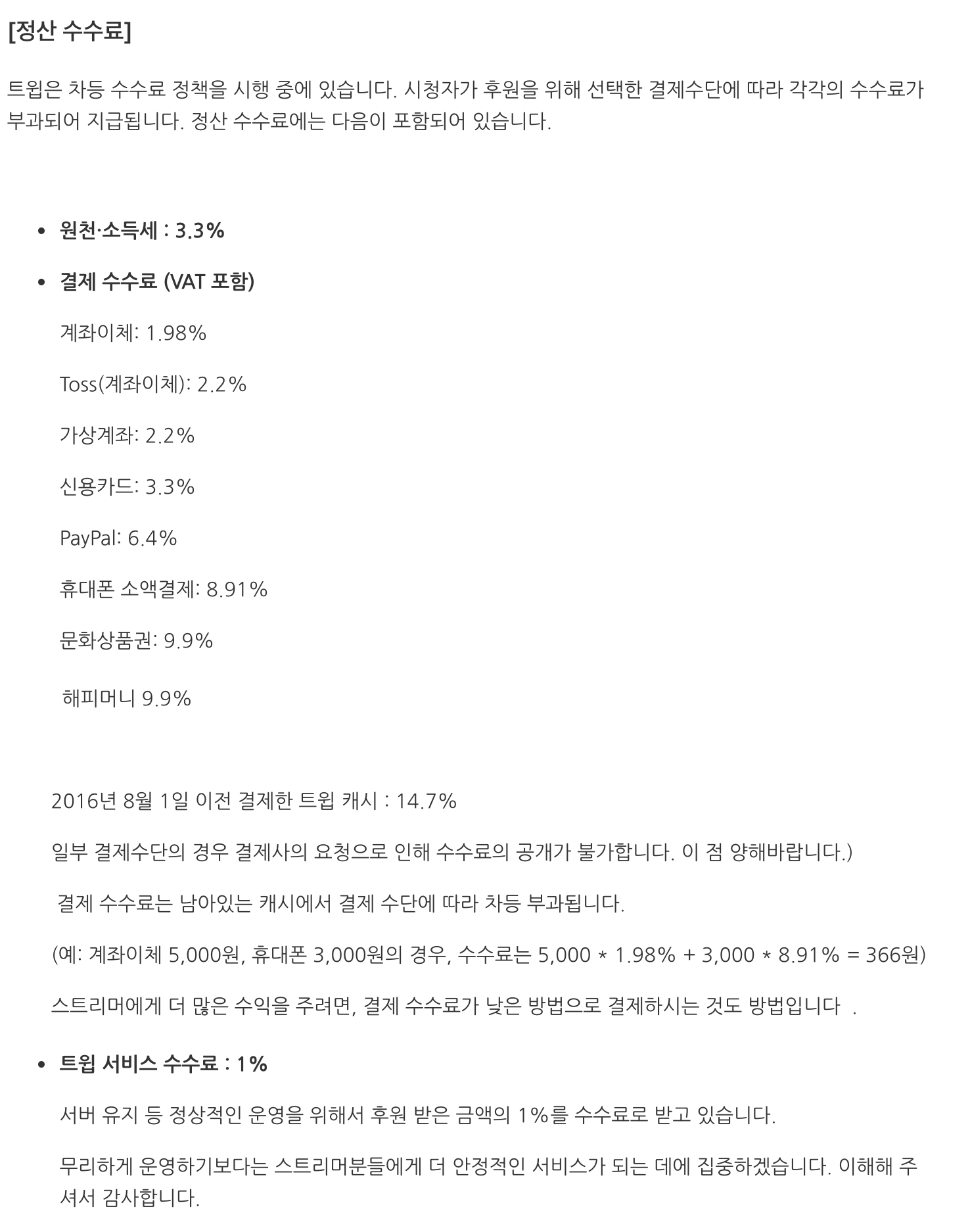 - 수수료 : 별풍선(일반BJ - 40% / 베스트BJ - 30% / 파트너BJ - 계약에 따라 다르지만 대략 20%), 구독 20%