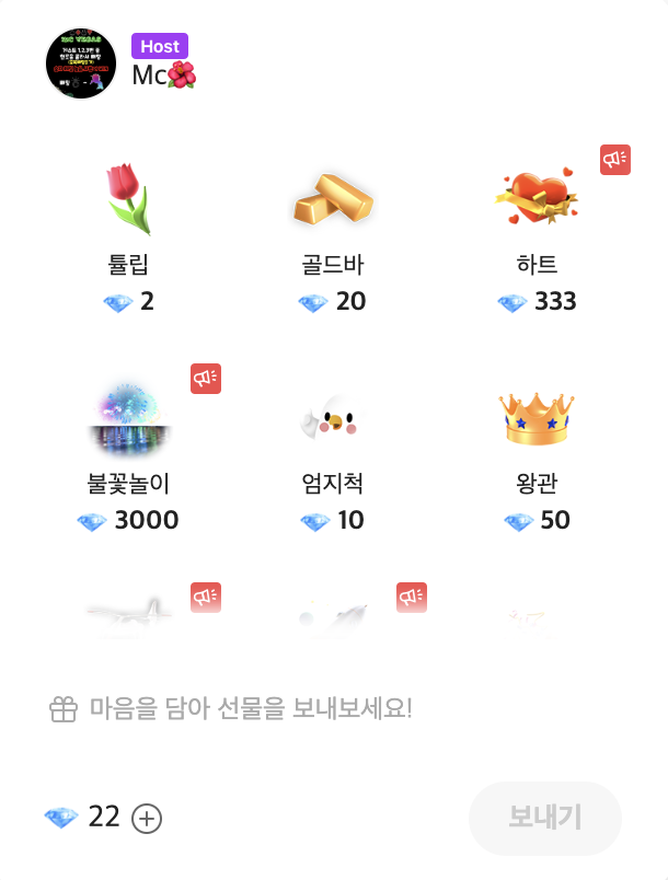- 실시간 오디오 방송과 녹음 방송에서 DJ(크리에이터)를 후원할 수 있는 돈과 같은 아이템.