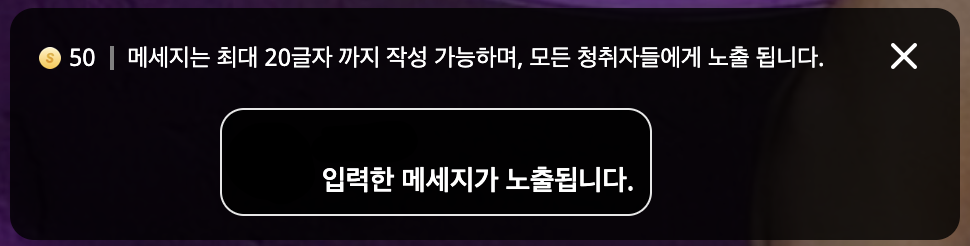 - 돈과 같은 개념의 캐시로 일정 금액을 후원하면 스트리머화면의 상단에 후원 금액 및 텍스트가 노출되며 음성 TTS 서비스로 읽어준다.