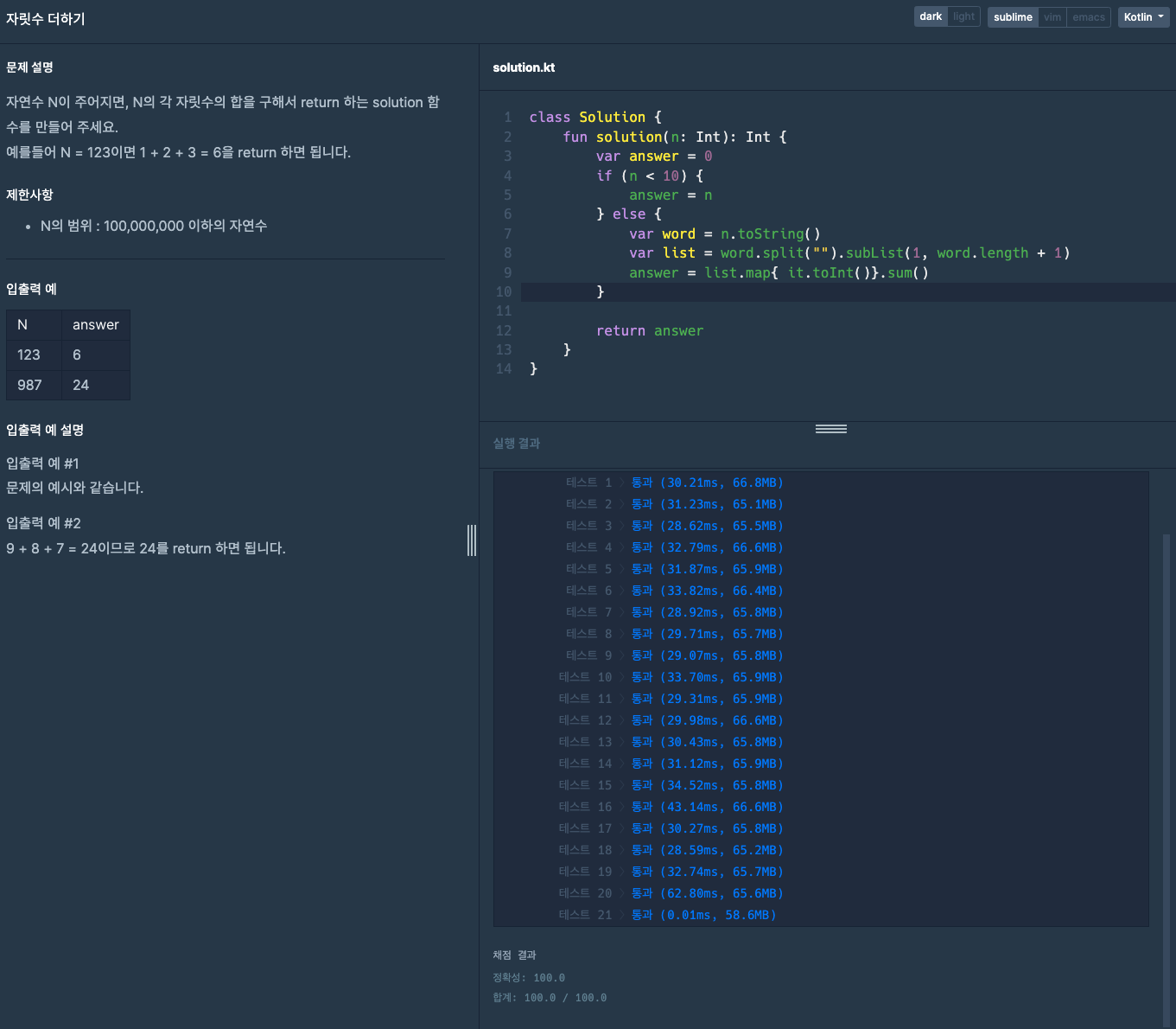 자연수 N이 주어지면, N의 각 자릿수의 합을 구해서 return 하는 solution 함수를 만들어 주세요.