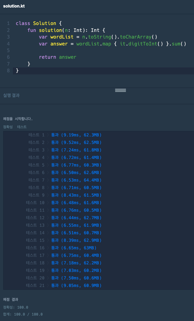 예를들어 N = 123이면 1 + 2 + 3 = 6을 return 하면 됩니다.