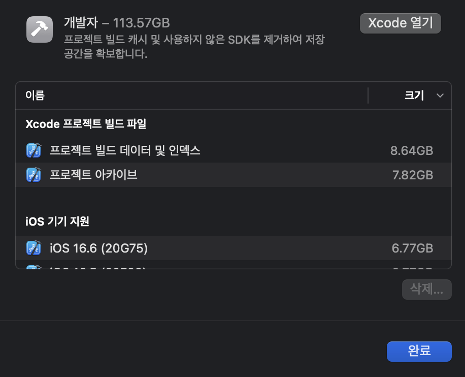 6. Xcode 프로젝트 빌드 파일 영역에 Xcode 캐시 삭제