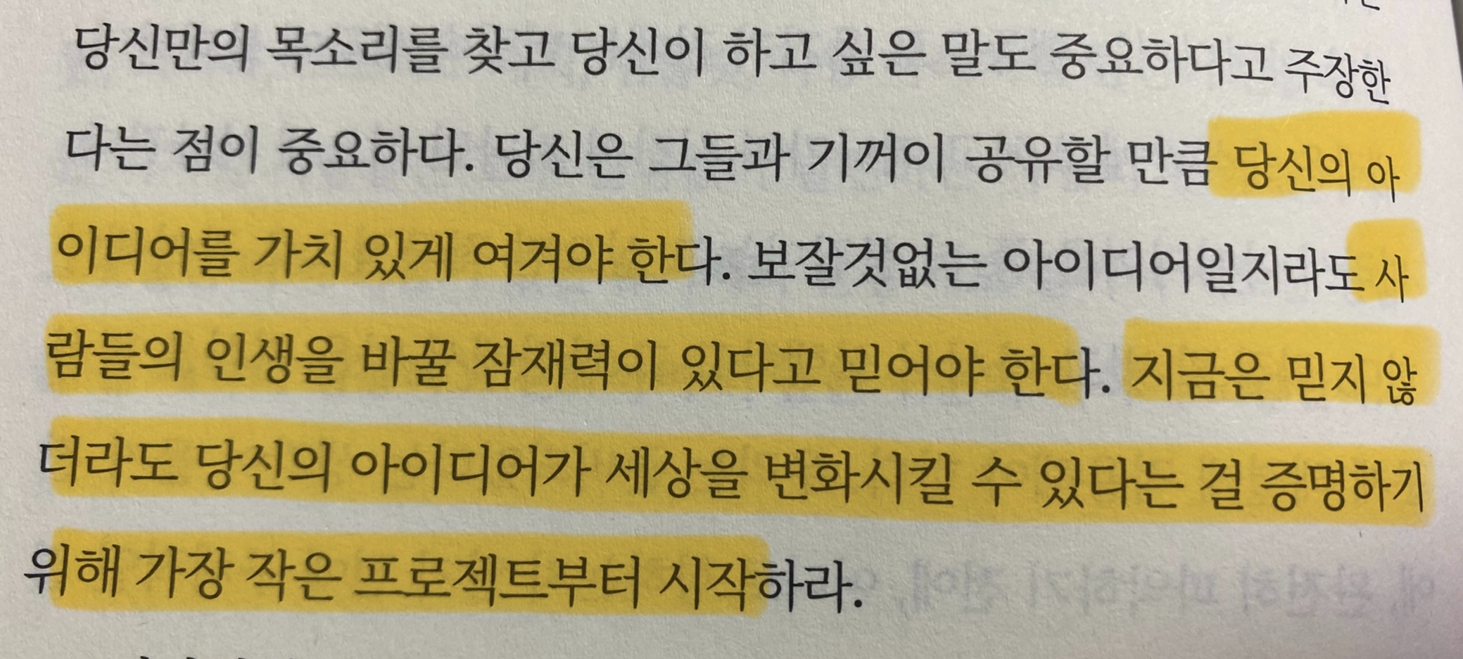 - 당신의 아이디어를 가치 있게 여겨야 한다. 보잘것없는 (것처럼 보이는) 아이디어일지라도 사람들의 인생을 바꿀 잠재력이 있다고 믿어야 한다.