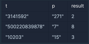 - t와 p는 숫자로만 이루어진 문자열이며, 0으로 시작하지 않습니다.