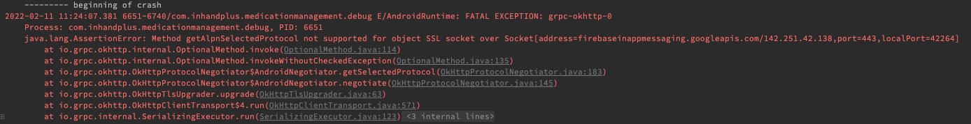 안드로이드에서 라이브러리 최신으로 올리면서 발생한 이슈 여러개의 라이브러리 버전을 업하다보니 정확히 무엇때문에 발생했는지 찾기에는 시간이 걸려서 패스 일단은 원인은 아래와 같다고 나왔기 때문에 해당 부분에 대해서 조치를 했다 이슈 2022-02-11 11:24:07.381 6651-6740/com.healthyryu.test.debug E/AndroidRuntime: FATAL EXCEPTION: grpc-okhttp-0 Process: com.healthyryu.test.debug, PID: 6651 java.lang.AssertionError: Method getAlpnSelectedProtocol not supported for object SSL socket over Socket[address=f..