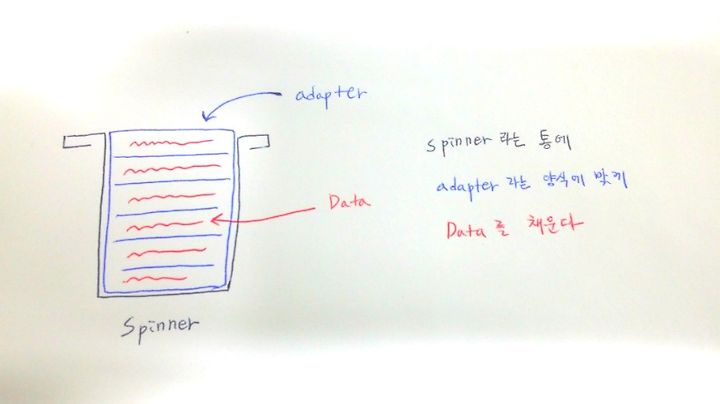 저는 아래의 그림과 같이 Spinner 라는 통에 Adapter 라는 양식에 Data를 담아서 setAdapter() 메서드를 통해서 끼워주는 느낌을 받았습니다.