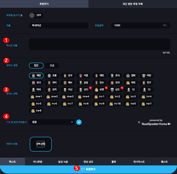 - 돈과 같은 개념의 캐시로 일정 금액을 후원하면 스트리머화면의 상단에 후원 금액 및 텍스트가 노출되며 음성 TTS 서비스로 읽어준다.