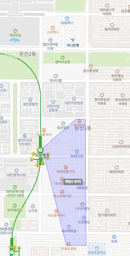 - 대전에서 둔산동에 학원이 제일 많음(아실 데이터 기준 약 181개), 학원거리까지 걸어서 약 23분 소요