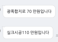 추후에 전화로 물어봤다. 그런데 70만원 얘기는 천장 등을 제외한 비용이라나?! 그래서 얘기 나온건 110만원이 나왔고, 다른곳에 전화해보니 120만원을 얘기하기에 세입자에게도 괜찮고 집주인에게도 괜찮아보이는 수준의 도배 가격은 100만원 이상인것 같다.
