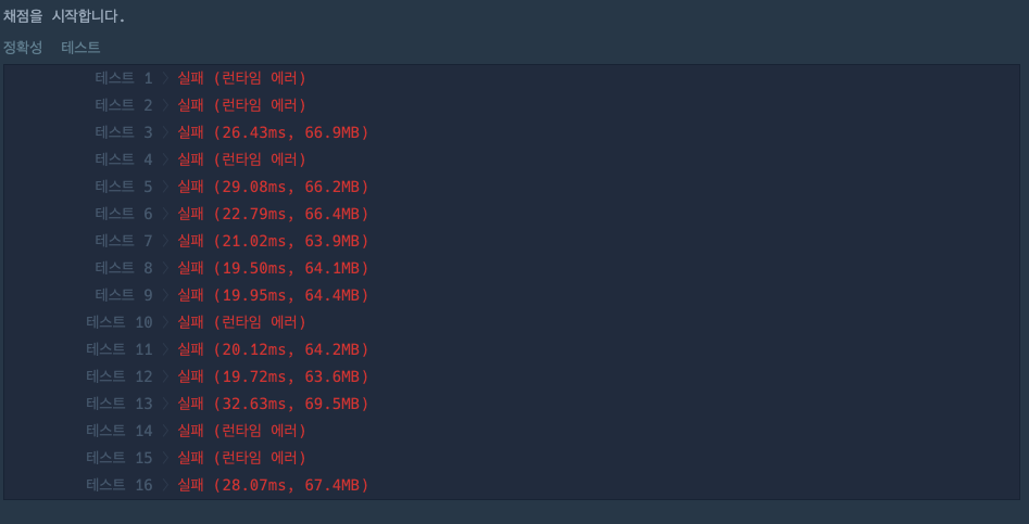 기본적인 입출력예만 통과하고 테스트케이스는 모조리 실패